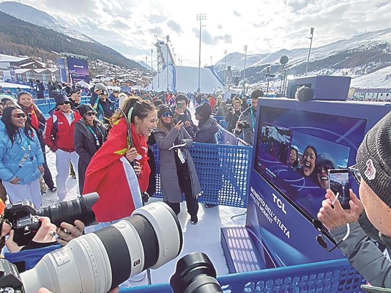 比赛结束后,谷爱凌跑到场边,第一时间和母亲拥抱。随后,她来到一台电视机前,与亲友团通过视频相见,分享喜悦。